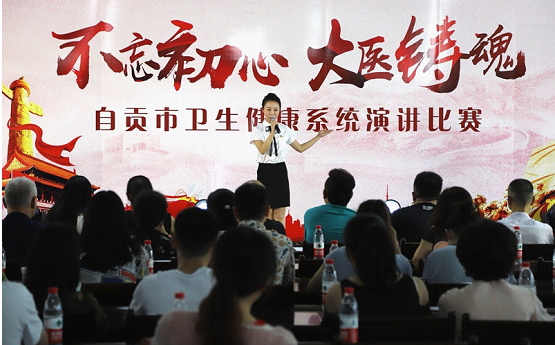 在新中国成立70周年、建党98周年之际,为弘扬爱国奋斗精神,坚定“不忘初心,牢记使命”信念,8月9日下午,“不忘初心,大医铸魂”演讲比赛在市卫健委举行。来自全市卫健系统的21名参赛选手参加比赛。自贡市第四人民医院参赛选手陈灿精彩的演讲赢得大家一致好评,以95.80分的成绩获得大赛三等奖。