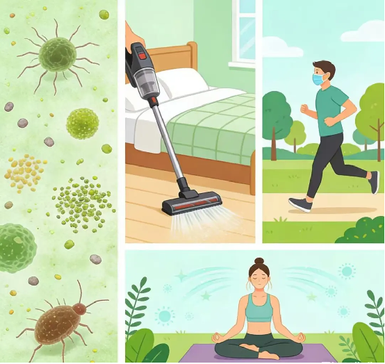 5.床单被套勤换洗(更换时需戴口罩哦),家中减少杂物堆积,保持室内干燥,使用空气净化器。