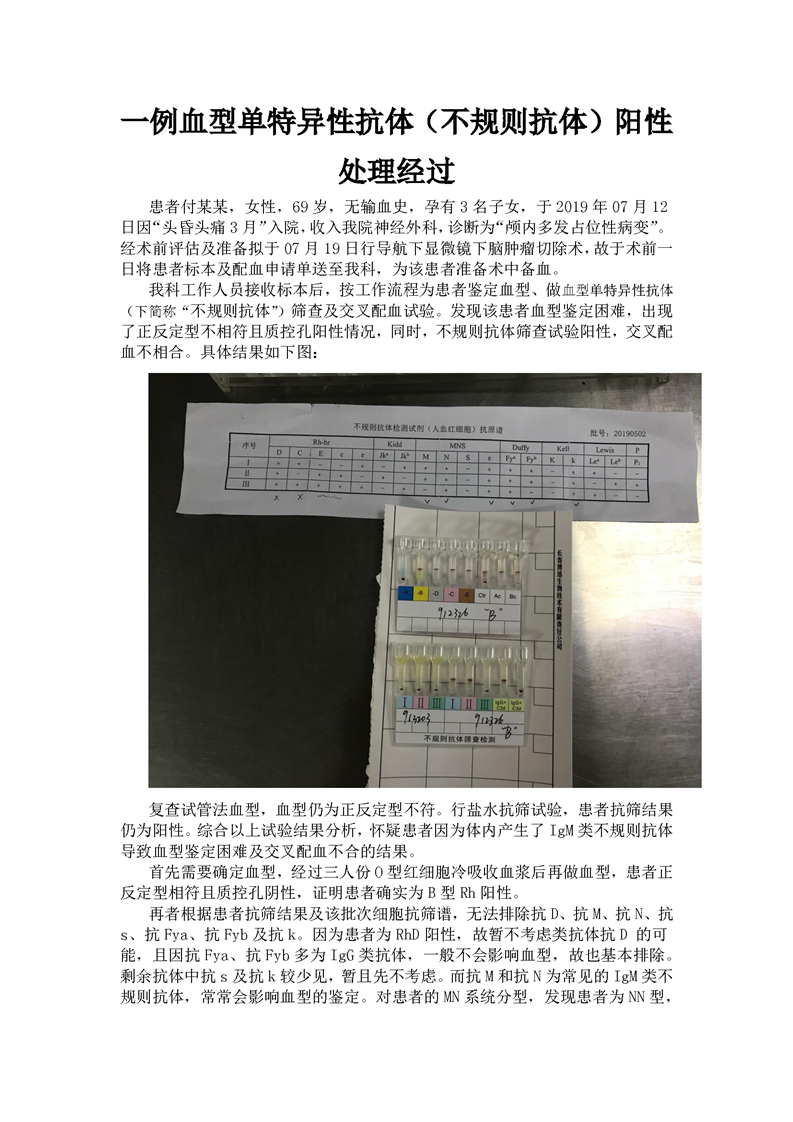 一例血型单特异性抗体(不规则抗体)阳性处理经过