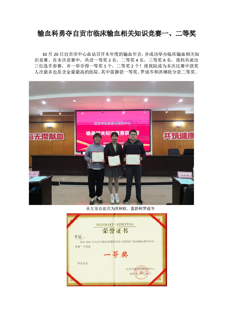 输血科勇夺自贡市临床输血相关知识竞赛一、二等奖
