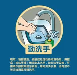 保持手卫生。双手减少接触眼、鼻及口。咳嗽、饭前便后、接触或处理动物排泄物后,要用流水洗手,或者使用含酒精成分的免洗洗手液。