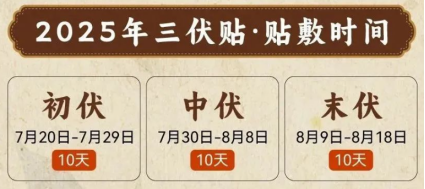 三天一次 1.伏前加强贴(选贴):2025年7月10日至7月19日,共10天。 2.初伏:2025年7月20日至7月29日,共10天。 3.中伏:2025年7月30日至8月8日,共10天。 4.末伏:2025年8月9日至8月18日,共10天。 5.伏后固本(选贴):2025年8月19日至8月28日,共10天。