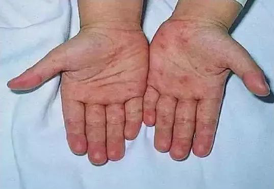 一两天后,透明的液体变浑浊,疱疹出现“凹脐”现象,然后结痂。此时,其他部位的皮肤上会再依次出现类似皮疹。 因为身上会同时存在不同时期的皮疹,所以大家戏称水痘为“四世同堂”。黏膜亦常受侵,见于口腔、咽部、眼结膜、外阴、肛门等处。 5.手足口病 每年的4月份开始,就进入手足口病的高发期。多种肠道病毒均可引起手足口病,最常见的是柯萨奇病毒A16型及肠道病毒71型。其感染途径包括消化道、呼吸道及接触传播。 手足口病主要发生在5岁以下的儿童,急性起病,发热、口痛、厌食、口腔黏膜出现散在疱疹或溃疡,位于舌、颊黏膜及硬腭等处为多,也可波及软腭、牙龈、扁桃体和咽部。