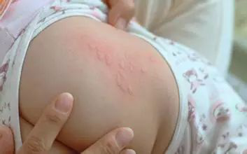 不论哪一种皮疹,都伴有一阵阵奇痒,婴儿往往倚着妈妈的身体摩擦止痒,直到小水疱擦破,形成大片潮红湿润的糜烂才肯罢休。遇热、遇湿都可使湿疹表现显著。 湿疹是一种变态反应性皮肤病,它也可能是一种由遗传性因素引起的皮肤病,如果爸爸妈妈小时候患湿疹,他们的宝宝也容易得湿疹。 7.荨麻疹 荨麻疹俗称“风疹块”,多由过敏反应所致。过敏原因较多,食物(花生、牛奶、鸡蛋最为常见)、药物、冷热空气、昆虫叮咬等。 荨麻疹常先有皮肤瘙痒,随即出现风团,呈鲜红色或苍白色、皮肤色,少数患者有水肿性红斑。风团的大小和形态不一,发作时间不定,部位不固定。风团逐渐蔓延,融合成片,由于真皮乳头水肿,可见表皮毛囊口向下凹陷。