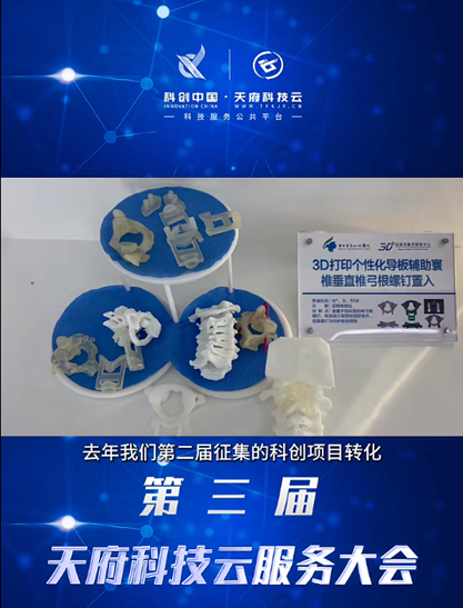 我院数字医学中心成果在第三届天府科技云服务大会现场签约时间:2024-01-22 浏览量:1659 来源: 作者:2024年1月18日,“第三届天府科技云服务大会”在成都顺利召开;我院数字医学中心2项成果受邀参加本次大会,其中一项完成现场签约,另一项作为路演项目在自贡专场重点推介。 现场共计33个项目完成签约仪式;我院的“一种3D打印逐级导板联合柔性钻辅助颈椎椎弓根螺钉植入技术”作为首轮推荐项目分别在自贡专场和闭幕式上完成了现场集中签约,四川省科协副主席徐勇,四川省科协调宣部部长施玉梅,自贡市委常委、副市长吴伟,自贡市科技局局长朱柱,自贡市科协党组书记、副主席邹发勇等各级领导出席本次签约仪式。该项目的市场转化将极大的降低颈椎内固定术风险,提高颈椎弓根螺钉置入的准确性,缩短颈椎内固定患者的康复周期。