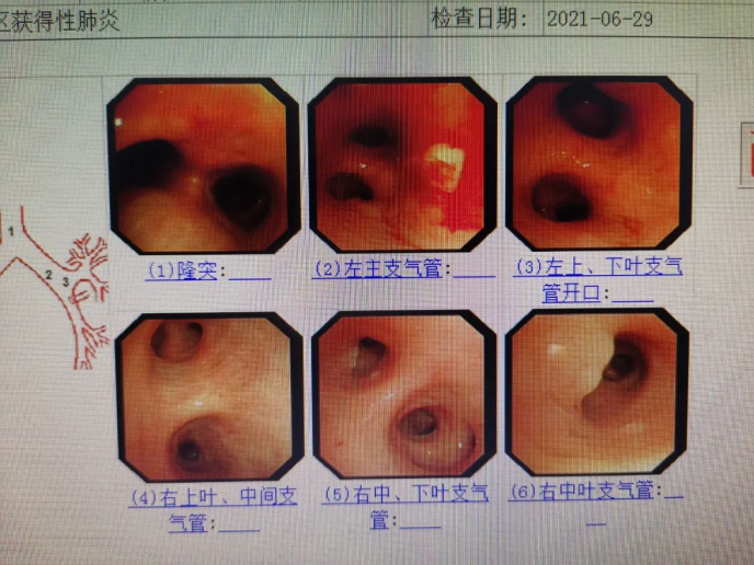 二、支气管镜检查:隆突基底部增宽;左主支气管下端局部粘膜充血、糜烂,触之易出血;右中叶支气管口粘膜可见一肉芽样隆起。在左主支气管下端及右中叶支气管口分别钳取活检并刷片送检,在左主支气管下端灌洗送检。