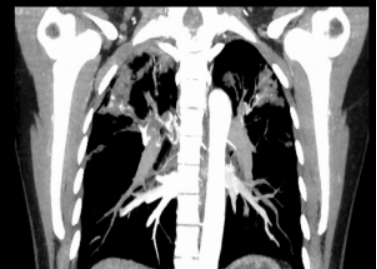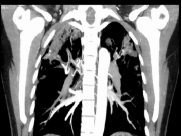 病例2 患者张姐,48岁女性,因“咯血15+小时”于2021-12-25入院。入院后立即予以了止血等治疗。 2021-12-26行胸部CT、支气管动脉成像: 1、双肺炎变,右肺上叶空洞形成,考虑继发性肺结核伴空洞形成可能。 2、右肺上叶支气管扩张。 3、右肺上叶支气管动脉增迂曲;主动脉钙化。