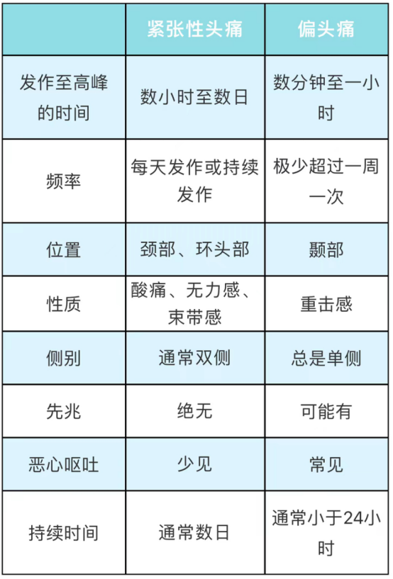 最常见的慢性头痛不是偏头痛,而是.........时间:2022-04-02 浏览量:5716 来源: 作者:十二月份我接诊了6位慢性头痛的同事,他们无一例外地都认为自己是“偏头痛”,“偏头痛”这个词可能在大家脑海里根深蒂固,基本就等同于所有慢性头痛,但其实临床上最常见的慢性头痛并不是偏头痛,而是紧张性头痛,约占头痛患者的40%,给我印象最深的是一位年轻同事隔一天都头痛,全头部持续性钝痛,早晨开始,中午最痛,甚至出现恶心呕吐,到晚上都没有办法自行缓解,只能服用止痛药缓解,这是比较典型的紧张性头痛,经过疼痛治疗后至今两周头痛没有再发,生活质量明显提高。那么今天我就简单聊一聊紧张性头痛和偏头痛的区别。