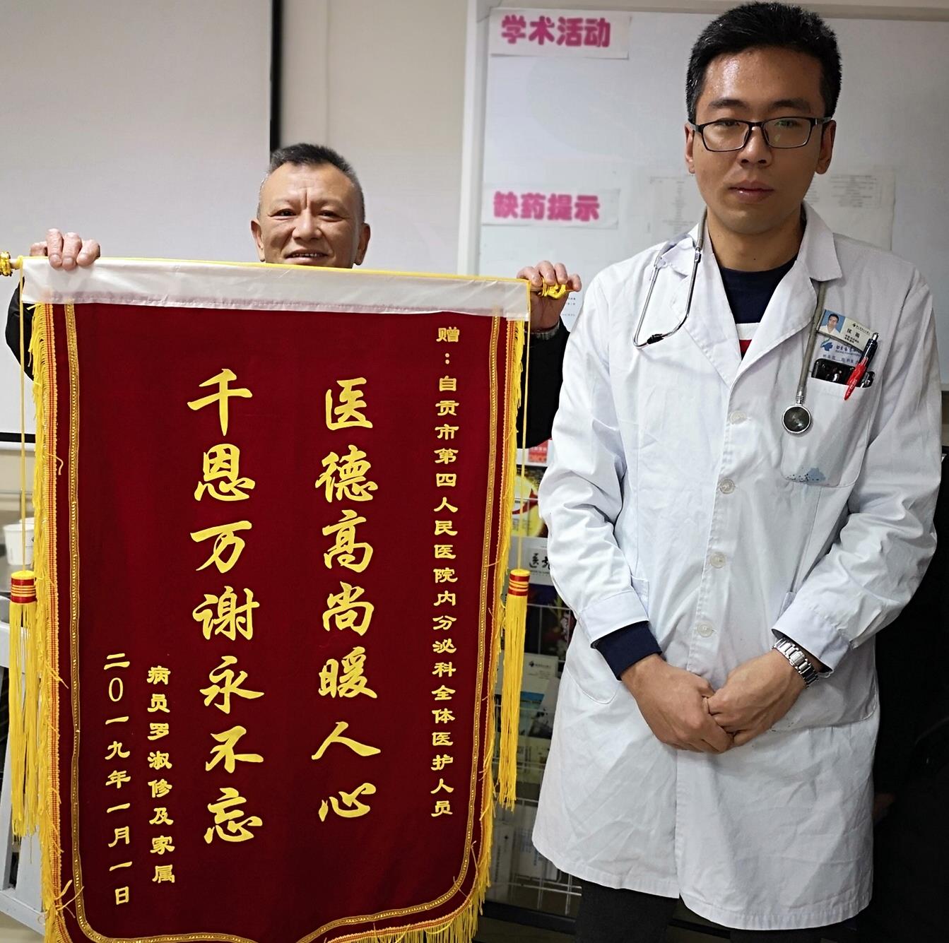 命悬一线,卧床二十多天的她竟走着出院了!时间:2019-01-11 浏览量:3851 来源: 作者:患者罗婆婆,女,80岁。于2018年12月7日因呼之不应30多分钟急诊入住我院EICU,入院时血糖21.3mmol/L,血钠达180mmol/L,血浆渗透压400mmol/L,经过EICU积极抢救治疗,生命体征基本平稳,内分泌科医生会诊后初步确诊为2型糖尿病性高渗性昏迷,2型糖尿病伴有多个并发症,水电解质酸碱代谢紊乱等。随后转入我科继续治疗。转入我科时,患者呈嗜睡状,保留胃管、尿管、中心静脉置管、骶尾部有一院外带入压疮等。由于患者基础疾病多,感染重,住院期间病情反复,内分泌科医生团队多次探讨病情,精益求精地为患者制定最佳治疗方案,终于在患者家属的积极配合下和在护理团队的精心护理下,卧床二十多天的罗婆婆逐渐恢复了意识,先后拔除了胃管、尿管。骶尾部压疮痊愈。并于2019年1月2日在家属的搀扶下走着出院。 后续: 出院当日,患者老伴儿、儿子及女儿满面笑容的来到医生办公室,儿子手握一面鲜红的锦旗送到主管医生侯雨手上,并连连表示感谢。女儿更是激动的说到:“真的非常感谢你们的精心医治和护理,原本我都以为这次她出不了院了,没想到恢复得这么好,太感谢了”。这也是内分泌科2019年收到的第一面锦旗。