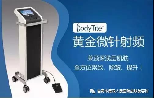 自贡市第四人民医院皮肤美容科引进新设备Bodytite黄金微针点阵平台是面部年轻化金标准。 Bodytite黄金微针点阵平台由半岛医疗集团研制生产,是利用微针将能量作用于不同深度靶组织,刺激和诱导胶原蛋白重组和再生,改变传统的治疗深度不确定、表皮损伤严重、能量传输衰减等问题,有效比避免结痂及色沉等并发症。黄金微针将机械微针、射频紧肤、中胚层疗法三效合一,使能量直达深层胶原并激发细胞活力以促新生,多维度立体塑造皮肤年轻化。突破性的克服了以往单一疗法的缺点和不足,能够极大激活胶原蛋白活性,还原肌肤时光的顶级嫩肤术,实现“换脸”般的神奇改变。