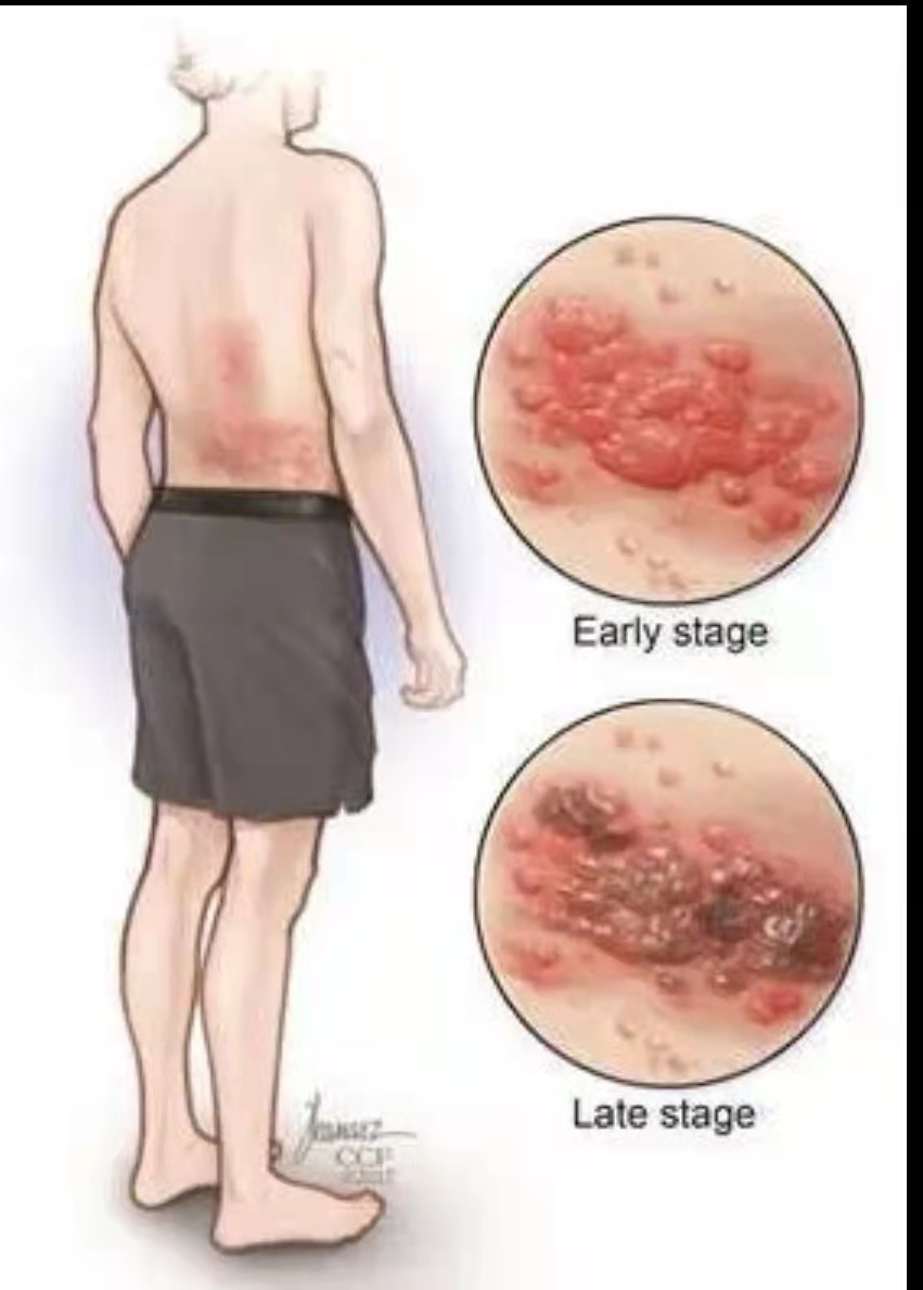 带状疱疹的健康指导时间:2022-04-19 浏览量:4775 来源: 作者: 带状疱疹是由水痘带状疱疹病毒引起的急性炎症性皮肤病,中医称为“缠腰火龙”“缠腰火丹”,我们俗称为“蛇缠腰”,是由水疱带状疱疹病毒所致。本病春秋季节多见,好发于成人,男性略多于女性。 西医治疗以抗病毒,抗炎,营养神经,止痛为主,静脉滴注:阿昔洛韦抗病毒,肌注甲钴铵、维生素B1、维生素B12营养神经;口服强的松以抗神经炎症,预防后遗神经痛,西咪替丁护胃。严格按照医嘱的剂量,时间,方法服药,并观察用药疗效和不良反应。在服药期间若出现恶心,呕吐,腹泻,乏力,失眠等,应及时报告医生。 红光照射可以促进伤口的修复愈合,起到消炎,止痛的作用。 联系电话:0813-8205653 联系电话:0813-2401422 联系电话0813-8110257