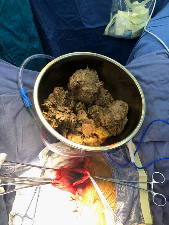 这样的腹腔“巨石”,您见过吗?时间:2019-04-30 浏览量:5302 来源: 作者:2019年4月,普外一科病房来了一位“大腹便便”的病人。她今年48岁了,但她的生活却因为这个“大肚子”而变得苦不堪言。 询问病史才得知,30年前,她因患“巨结肠”排便困难,在当地医院做了乙状结肠的双腔造瘘手术。而之后,腹部开始出现一个包块并逐渐长大,而多处就医无效。当我们见到她的时候,这个腹部包块巨大而且坚硬如石,并且有膀胱受压的症状,有尿频、尿急、尿不尽等。 到底是个啥病呢?于是,我们给她做了腹部CT检查,发现腹腔包块其实是造瘘口远端扩张的乙状结肠和直肠,其中填满了粪石,而占据整个盆腔和中下腹腔。