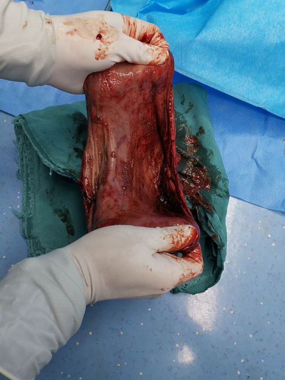 于是,她入院后完善了术前检查,并予营养支持等准备妥当。我们科室进行了一次专业的术前讨论,为她制定了一套方案:切除造瘘远端肠管,改双腔为单腔造瘘。征得她及家属同意后,我们于4月中旬,给她做了手术。 术中,我们发现肛门严重狭窄,而远端乙状结肠和直肠扩张直径约20cm,腔内填满坚硬的粪石,膀胱也挤压变形。经过1个多小时的手术,我们完成了手术计划:距肛门3cm切除扩张的肠管,近端降结肠行单腔造瘘。 术后,她安返病房,康复顺利,膀胱压迫症状也已缓解。她也在上周痊愈出院。