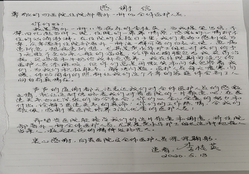 优质服务暖人心,家属送来感谢信时间:2020-05-30 浏览量:5101 来源:学习 作者:优质服务暖人心,家属送来感谢信 5月18日上午9时,自贡市第四人民医院普外一科收到了一封患者家属送来的感谢信,以表达对普外一科全体医护人员的感激之情,特别是对黄永华老师表示高度赞扬。患者家属激动的说:“你们总是用微笑和问候包容着我们,为我们积极联系,解决问题,医护人员每天嘘寒问暖,体贴周到的关心让我们这个不幸的家庭体会到人间自有真情在。