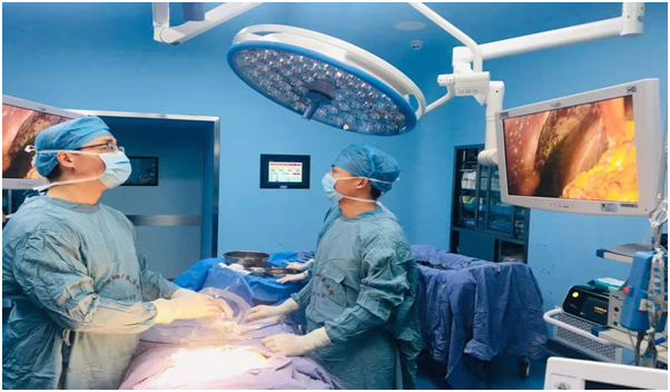 晚期胃癌治疗的希望 ------腹腔减瘤+热灌注化疗(HIPEC)术时间:2019-07-28 浏览量:6406 来源: 作者:即使作为经验丰富的胃肠外科专业的医生,在面对晚期胃癌腹腔广泛种植转移伴大量腹水的患者时,内心是近乎无助及绝望的。病人因腹腔脏器均浸泡在腹水中,会出现严重的腹胀、腹痛、纳差、消瘦、贫血等症状,生活质量差,生存期短。 近日自贡市第四人民医院普外一科就收治了一名胃癌伴腹腔广泛种植转移并大量腹水的老年女性患者。患者是家属轮椅推来就诊的,身体非常虚弱,之前已经在省肿瘤医院、华西医院等等各级医院诊治,均被劝回当地医院保守治疗。偶然的机会,家属了解到我科室在开展腹腔热灌注治疗技术,遂到我科雷跃华副主任医师门诊咨询,在医生详细了解病员的病情并评估后,认为该病员适宜行腹腔减瘤并热灌注治疗技术,在雷跃华副主任医师耐心向家属介绍该技术的适应症和优缺点后,家属抱着最后一丝希望将病员送入院,期间其大女儿远在英国也通过电话与雷跃华医生做了充分沟通。 患者经过积极术前检查与准备,于2019年7月8日在腹腔镜下完成了大网膜切除减瘤+腹腔热灌注治疗,其中术中完成热灌注治疗一次,术后在病房完成第二、三次腹腔热灌注治疗,整个治疗过程顺利,病员无不适反应。在我们的悉心治疗下,老人家在热灌注治疗完成后第三天,既往因大量腹水引起的腹胀、食欲下降的症状明显缓解,每日腹腔引流的腹水逐渐减少,个人精神面貌也明显改善,能在家人搀扶下在病房活动。术后10天病员入院时的腹痛、腹胀症状完全消失,精神食欲明显改善,可自己下床活动,顺利办理出院。在佩服老人家坚强毅力的同时,我们也由衷为老人家能够获得更高的生活质量、延长癌症生存期而高兴!