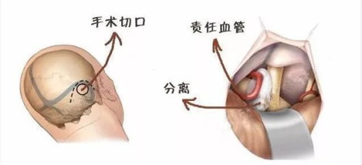 微血管减压手术即在全麻下在患者耳后发迹内作一长约5cm的切口,钻取约硬币大小的骨孔,然后使用显微镜或神经内镜,沿着小脑表面解剖间隙,到达面神经根部,寻找责任血管(即压迫面神经致临床症状的血管),使用一小片垫片见血管与神经分离开就结束手术。据报道,微血管减压手术的长期治愈率为80-90%,这也是唯一的长效疗法。