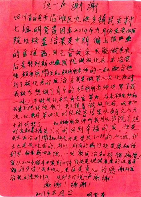患者@医生,“喜得好你们当初骂我一顿哟,值得惨了!”时间:2017-03-13 浏览量:4060 来源:自贡市第四人民医院 作者:2月20日,沿滩区九洪乡村民明登贵来到他很长时间没再来过的自贡市第四人民医院肿瘤科,找到老熟人缪继东、杨丽丽以及全体医护人员,将一张红纸塞给他们。原来明登贵此行的目的是为了送一封自己亲手写的感谢信,字里行间里,他用朴实的语言道出了一位癌症患者在医护人员帮助下战胜病魔的心声。 2014年9月,明登贵感觉身体不适来到市四医院看病,“检查确诊我患了大毛病——食道癌。” 听到“癌”字,明登贵差点晕过去。因受位置和气管等因素影响,医务人员无法通过手术帮助他摘除肿瘤,“完了,完了,这辈子要‘交代’了。”手术希望破灭后,明登贵一度消沉,即使来到肿瘤科进行放化疗,他也感觉自己“没救了。”当放化疗进行到第二个疗程时,明登贵产生了放弃的想法,他告诉医护人员“不治了”,还让妻子给他收拾行李,他要卷铺盖卷走人。 “不做治疗,回去就相当于在家等死。”肿瘤科副主任缪继东和主管医生杨丽丽得知明登贵的想法后,情急之下,骂了他一顿。这顿骂,还挺奏效,明登贵没再执意要回家,而是陷入了沉思中,抓住机会,缪继东、杨丽丽以及科室医护人员和家属齐上阵,轮番给他做思想工作,通过耐心细致的开导,大家终于说服了明登贵。 积极配合完成四个疗程的放化疗治疗后,医务人员通知明登贵,“现在可以安心回家休养了。”经过治疗,明登贵病情大大好转。“看来癌症也不是说的那样可怕嘛!”接到出院通知,明登贵喜出望外,高兴的和家人一起回到了家中。 “一晃两年多过去了,我的身体还跟以前一样。要不是当时医生那顿骂,把我骂醒了,估计我都……”为表达感激之情,明登贵亲手写了一封题为《说一声谢谢》的感谢信,交到了帮助过他的医务人员手中。