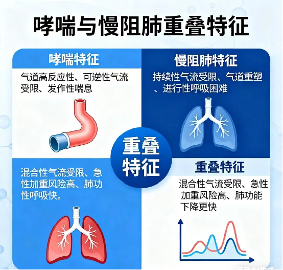 临床上,部分患者可能同时表现出哮喘和慢阻肺的特征,这种情况过去常称为“哮喘-慢阻肺重叠”。多见于长期吸烟的哮喘患者或具有过敏体质的慢阻肺患者,或有多年哮喘病史后出现不可逆气流受限的患者。这类患者的病情更为复杂,急性加重风险更高,治疗需要更加个体化,通常需要联合使用吸入性糖皮质激素和长效支气管舒张剂,并严格遵循戒烟和肺康复治疗。