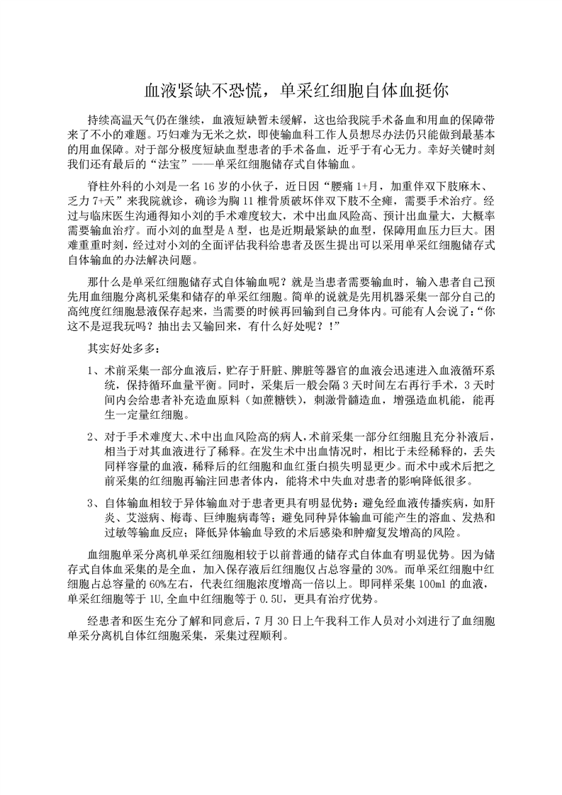 血液紧缺不恐慌,单采红细胞自体血挺你