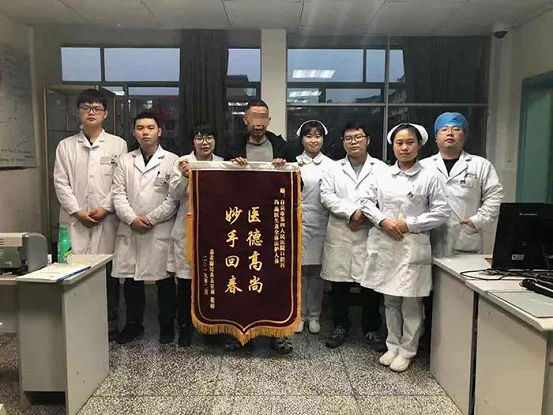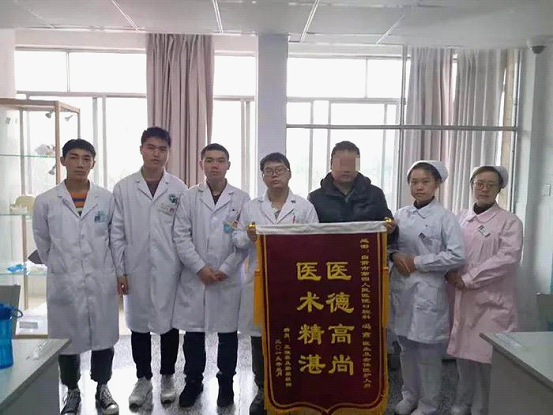 原来里面是一面鲜红的锦旗,上面写着:医德高尚,妙手回春。