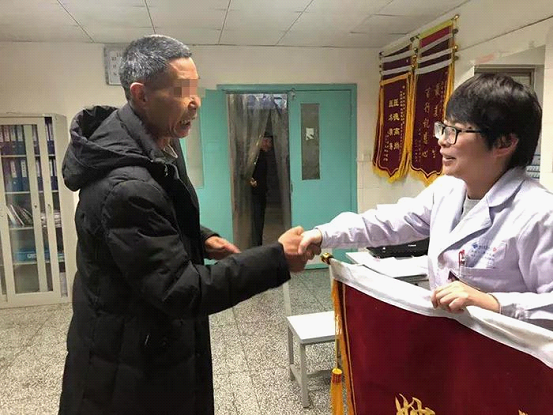 廖爷爷激动地握着冯医生的手说道:“冯医生,谢谢你这么照顾我,我也不知道咋子感谢你,看见办公室有很多锦旗,就想着做一幅给你。”