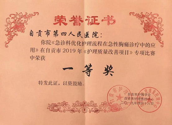 4月16日,在 “自贡市护理学会联合市质控中心2019年市护理质量专项比赛”汇报中,市四医院急诊科护士陈成、刘函莉、曾燕丽比赛项目《缩短STEMI患者D-TO-B时间》在本次“自贡市护理质量专项比赛”脱颖而出,获得一等奖。