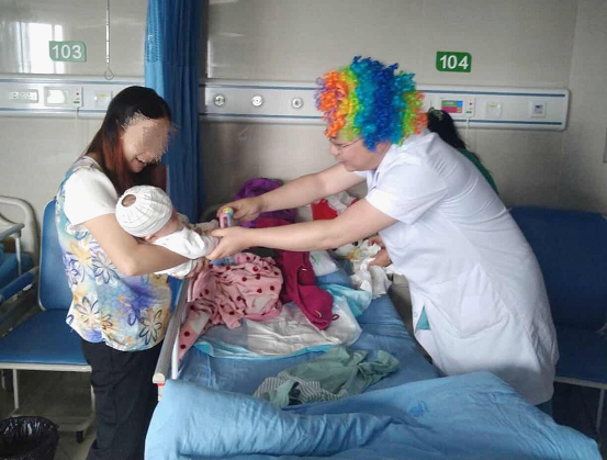 6月1日,市四医院团委、关工委、川卫康院志愿服务队联合医院儿科开展“快乐病房”主题活动。志愿者们头戴发套、顶着大红鼻头与全院140余名住院儿童共同度过了一个快乐的“六一”儿童节。