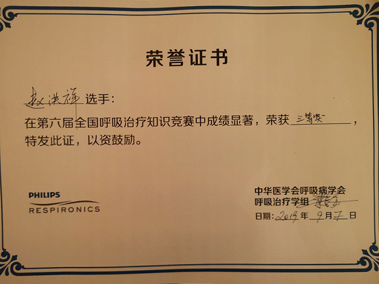 近日,2019年中华医学会呼吸病学年会在湖北省武汉市顺利召开,会上举办了第六届全国呼吸治疗知识竞赛,市四医院重症医学科护士赵洪祥在比赛中脱颖而出,获得三等奖。
