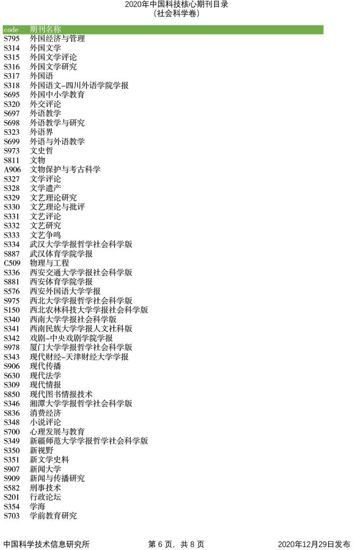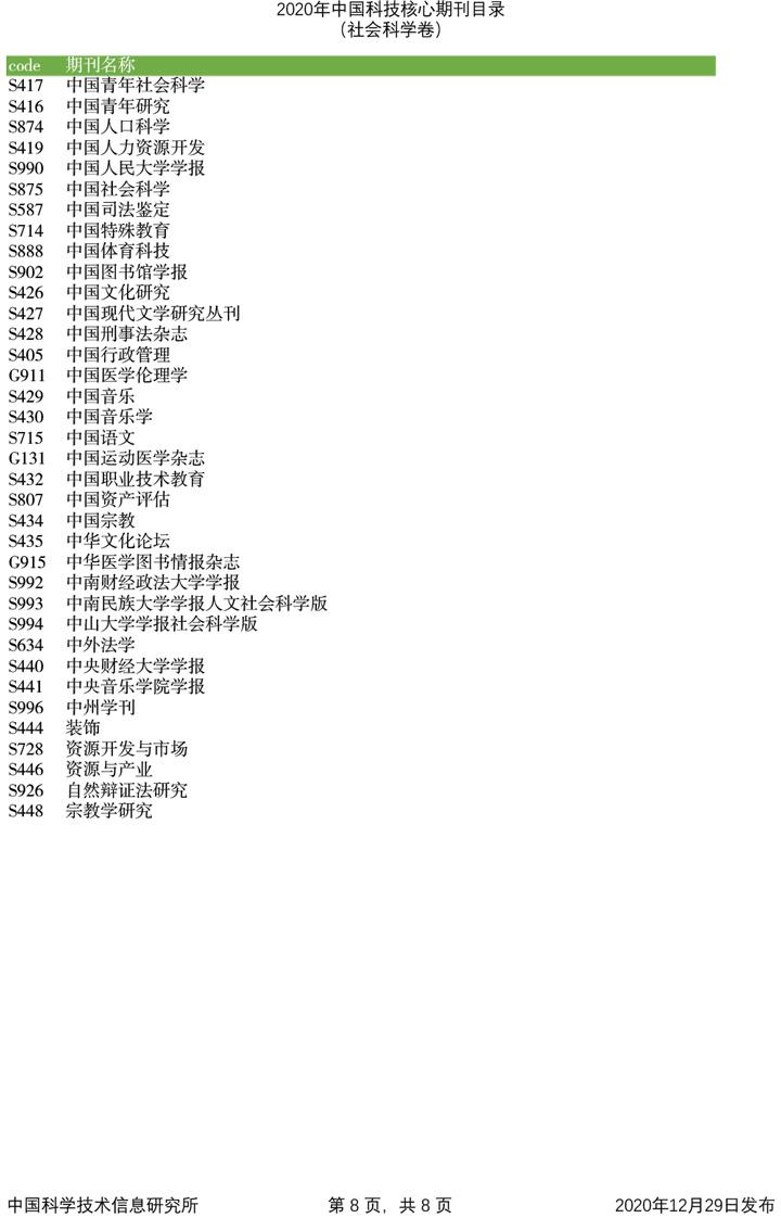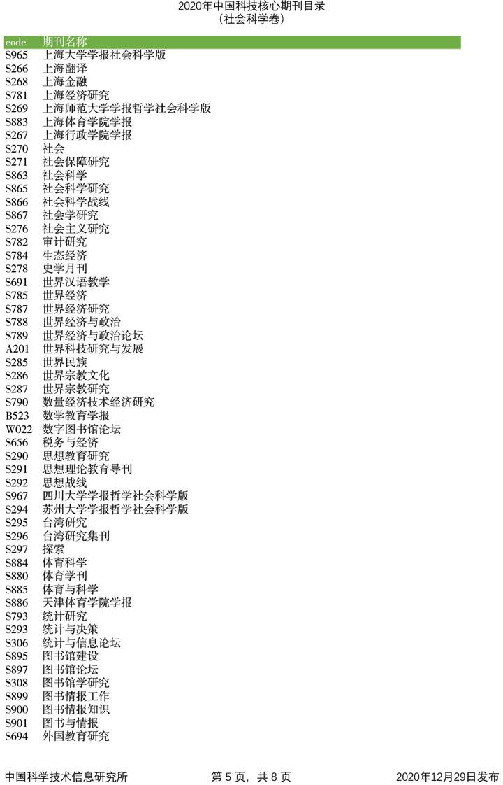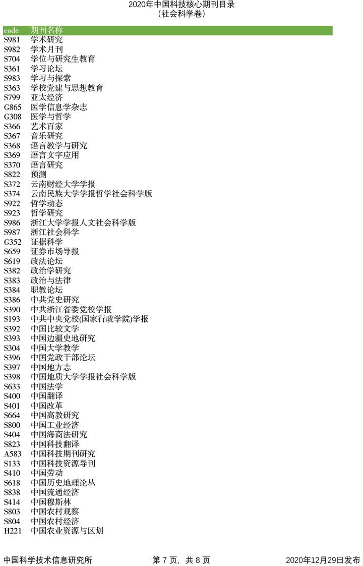 2020年中国科技论文统计源期刊目录(社会科学卷)