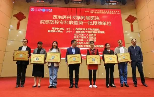 近日,2023四川泸州医院感染管理学术年会暨川南渝西院感防控专科联盟成立大会在泸州召开,市四医院获专科联盟首批副理事长单位,该院副院长廖学琴代表医院出席并获授牌,院感科科长王晓朦当选为首届理事会副理事长。在学术年会中,市四医院刘鸿德、王晓朦的论文作品分别获得二等奖、三等奖。