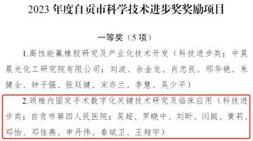 近日,《自贡市人民政府关于授予2023年度自贡市科学技术进步奖的决定》发布,市四医院4项科研获科技进步奖,其中骨科中心吴超团队《颈椎内固定手术数字化关键技术研究及临床应用》获得一等奖,另有3项获得三等奖。这是近年来,该院第三次获得市科技进步一等奖。