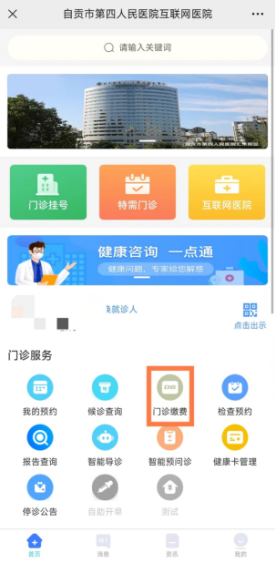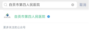 第一步:微信搜索自贡市第四人民医院公众号,关注并进入公众号