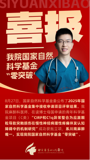 近日,国家自然科学基金委公布了2025年度国家自然科学基金集中接收申请项目评审结果。市四医院麻醉科医师、在读博士母国申请的青年科学基金项目(C类)“CIRP和C1q异常整合为应激颗粒导致突触损伤在慢性神经病理性疼痛伴发认知障碍中的机制研究”成功获批,实现了医院国家自然科学基金项目“零的突破”。