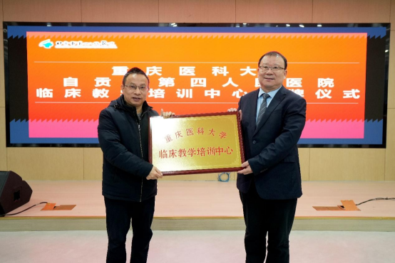 授牌仪式上,重庆医科大学教务处处长朱丹宣读自贡市第四人民医院成为重庆医科大学临床教学培训中心的文件。随后,重庆医科大学副校长邱景富,自贡市第四人民医院党委副书记、院长殷明刚共同为临床教学培训中心揭牌。
