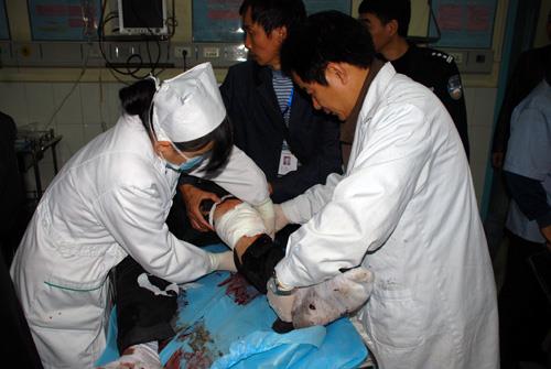 下午3点15分,第一辆救护车返回市四医院,院内已启动突发公共事件预案。当天,该院正举行中高层管理人员培训,院长刘建辉、分管副院长杜冲等院领导亲临现场,组织指挥抢救。接到任务纷纷赶来的急诊科医务人员和各外科主任、住院总对10名送往该院的患者(另一人被送往中医院,于一天后转至市四医院)进行了二对一的处置。一名重伤员迅速转ICU抢救,其余病人分别送神经外科、胸外科、肝胆外科、普外科作进一步抢救治疗。当晚,6名重伤病人相继被送进手术室,所有伤员都得到了及时有效的救治。“10名伤员,7人需要手术,近几年这种情况在我市都属少见。”该院副院长杜冲介绍说。
