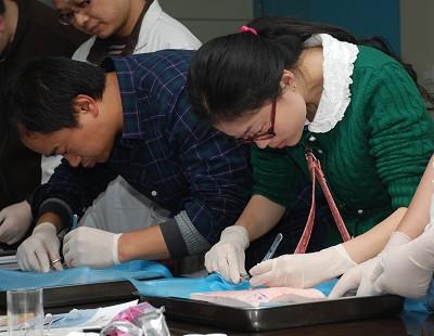 10日下午,由副主任医师张学秀对首批20名医务人员进行了打结和缝合技术的培训。她就缝合的原则、方法,打结的方法作了详细讲授,并播放了操作录像片,规范了操作方法。之后,学员们分组进行了实际操作,以不同的方法在动物标本上进行缝合操作。由于使用了真实可感的动物标本,学员们参与热情高,操作能力得到了提高。