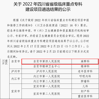 此外在近日省卫健委公布的关于2022年四川省省级临床重点专科建设项目遴选结果的公示中市四医院麻醉科获评省级临床重点专科建设项目