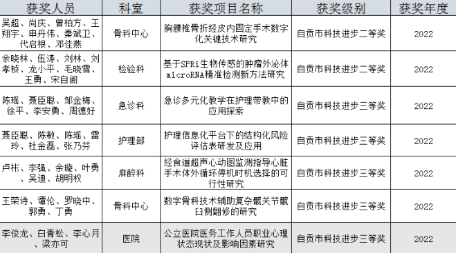 近日,自贡市委、市政府召开自贡市科学技术奖励大会,表彰为全市科技事业和经济社会发展作出突出贡献的科技工作者,会上骨科中心主任吴超被授予第十三届自贡市科学技术杰出贡献奖,据了解,这是我市卫生健康系统首位获得该奖项的医务工作者。此外,市四医院还有多个科研项目分获自贡市科技进步二、三等奖。