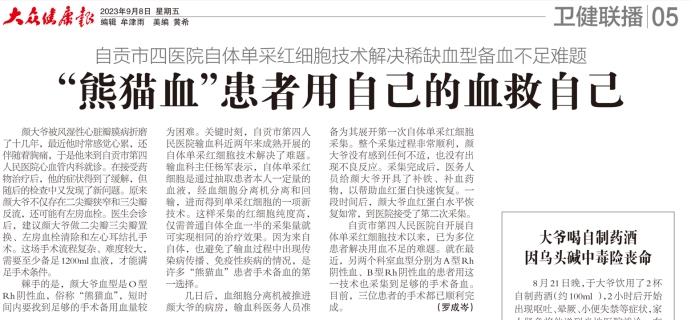 棘手的是,颜大爷血型是O型Rh阴性血,俗称“熊猫血”,短时间内要找到足够的手术备用血量较为困难。关键时刻,自贡市第四人民医院输血科近两年来成熟开展的自体单采红细胞技术解决了难题。输血科主任杨军表示,自体单采红细胞是通过抽取患者本人一定量的血液,经血细胞分离机分离和回输,进而得到单采红细胞的一项新技术。这样采集的红细胞纯度高,仅需普通自体全血一半的采集量就可实现相同的治疗效果。因为来自自体,也避免了输血过程中出现传染病传播、免疫性疾病的情况,是许多“熊猫血”患者手术备血的第一选择。