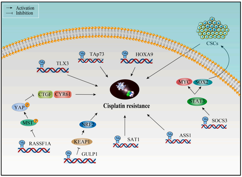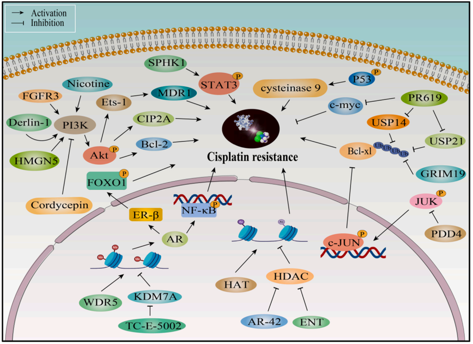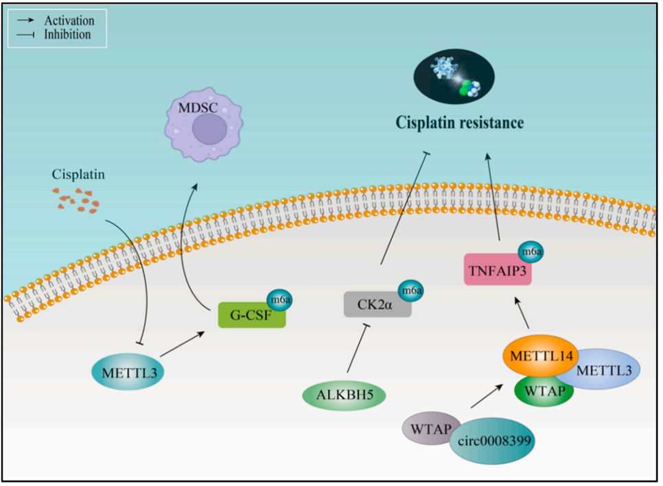 DNA methylation is an important epigenetic mechanism regulating cisplatinresistance in bladder cancer. 文章系统地阐述了与膀胱癌中顺铂耐药相关的表观遗传机制,包括DNA甲基化、非编码RNA调控、m6A修饰和翻译后修饰等。某些非编码RNA(如PVT1、LINC00857和HIF1A-AS2等)可通过调节其下游基因的表达来促进顺铂耐药性,而某些circRNA则可通过调节多种信号通路来影响顺铂的治疗效果。包括circELP3、Cdr1as和circLIFR等在内的circRNA上调参与膀胱癌化疗耐药,相反circFAM114A2等circRNA有助于化疗敏感性,而circ0008399通过促进WTAP/METTL3/METTL14形成甲基转移酶复合物,并以m6A依赖的方式增加TNFAIP3的表达,从而降低膀胱癌对顺铂的敏感性。此外,某些组蛋白乙酰化修饰酶和去乙酰化修饰酶也被证实可以影响顺铂耐药性。
