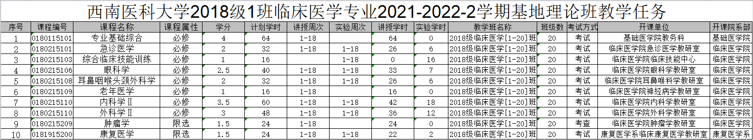 我院始终把教学工作置于中心地位,不断完善教学管理制度,通过各类会议等讨论教学工作,定期召开全院性教学例会,部署教学任务,解决教学问题。现将西南医科大学理论班教学任务公布如下,请各教研室严格按要求执行,确保教学任务顺利完成: