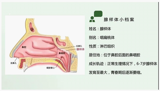 今天,我们就来扒一扒“腺样体面容那些事”。 问题一:腺样体是个啥子,有哪些特点? 腺样体是位于鼻咽顶后壁的淋巴组织,参与组成咽淋巴内环(Waldeyer’s环)。儿童生长发育期中腺样体可有生理性肥大。一般认为腺样体在4-6岁时增长最快,6岁左右最大,10岁以后多数逐渐退化萎缩。
