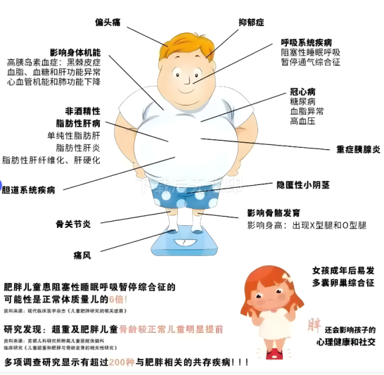 健康杀手:儿童肥胖时间:2024-12-04 浏览量:3024 来源:自贡市第四人民医院 作者:儿童肥胖症是指儿童体内过多的能量以脂肪的形式存储,身体脂肪重量超标并与高脂血症、高血压、糖尿病以及心血管疾病风险增高相关的一种疾病。 肥胖的危害,如下图:
