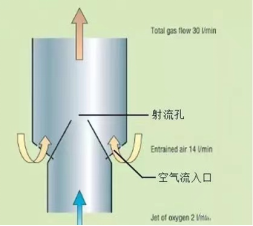 图2文丘里装置直接连接面罩 (二)文丘里原理 文丘里原理较为复杂,其涉及流体物理学中的连续性方程及伯努力原理。即当一定流量的氧气通过横截面积较小的射流孔(图3)后流速增大形成高速气流,产生一定负压,进而卷入周围空气,最终形成高流量的空氧混合气流。[2-3]这种效应就如同当一列高速的火车驶过时,在其周围形成的气流会将路旁的树叶“吸”向列车一样。根据其原理得知,吸入氧浓度与射流孔的孔径、空气流入口径及氧流量大小有关[4]。当我们将射流孔口径、氧流量减小或将空气流入口径增大时,氧浓度会随之减小,反之增大[5](图4)。文丘里面罩喷射入面罩的气流大于病人吸气时的最高流速和潮气量,所以吸氧浓度恒定,因高流速的气体不断冲洗面罩内部,呼出气难以在面罩中滞留,故基本无重复呼吸,在治疗低氧血症伴高碳酸血症的病人需要选择文丘里面罩,能准确地控制好氧浓度。