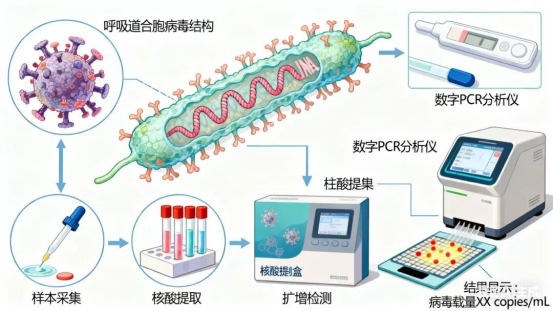 二、如何判断呼吸道合胞病毒 临床表现 早期症状(1-3 天):与普通感冒相似 流鼻涕、咳嗽、发热、食欲下降 进展期典型症状(4-8 天):需警惕病情加重 呼吸急促 咳嗽、喘息加重 鼻翼煽动,呼吸时三凹征(锁骨/肋骨/胸骨窝吸气凹陷) 婴儿出现喂养困难 特别提醒:6 个月以下婴儿症状易隐蔽,可能不出现咳嗽、发热,仅表现为嗜睡、烦躁、喂养困难,甚至呼吸暂停,需家长格外留意