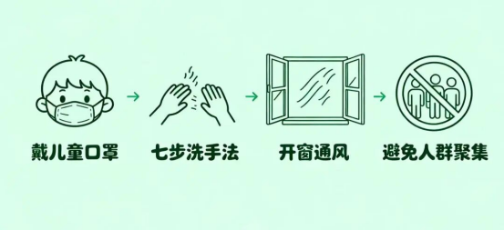 合胞病毒可以重复感染,也易发生家庭传播。因此,提前预防、降低感染和发病风险尤为重要!应做到如下几点: 家庭预防 1.做好手部卫生:家长及照顾者勤洗手,用肥皂和流动水搓洗至少20秒,尤其接触孩子前、处理分泌物后 2.减少暴露风险:避免带婴幼儿去人群密集、通风差的场所,如超市、游乐场等 3.隔离感冒者:家庭成员若感冒,需佩戴口罩,避免与婴幼儿密切接触,防止病毒传播 4.避免共用物品:不与他人共用餐具、水杯、毛巾等个人物品,减少接触传播机会 5.定期清洁消毒:经常清洁、消毒家中常接触的表面,如门把手、玩具、婴儿床围栏等 6.喂养强化:提倡母乳喂养至少6个月,母乳中SIgA抗体可增强免疫力,降低感染风险