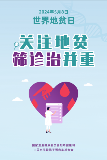 2024年5月8日是第31个“世界地贫日”。以"关注地贫,筛诊治并重”为主题,旨在提高全社会对地贫的认知和关注,引导新婚及计划怀孕夫妇积极参加地贫筛查及后续产前诊断等服务,加强地贫防控,呵护母婴健康。