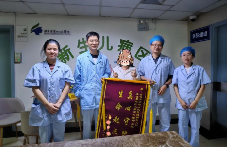 9月的一天,一个33+5周早产儿宝宝提前来到世界上,出生时体重仅1.2公斤,各脏器功能发育极不成熟,呼吸费力有明显吸气三凹征,我院新生儿科医护团队立即予以抢救,呼吸机辅助通气,宝宝的病情才逐渐稳定。因宝宝体重轻,极易并发心力衰竭、颅内出血、败血症、高胆红素脑病等情况,医护人员24小时守护在患儿身边。医护人员为患儿制订了精确的诊疗护理方案,不分昼夜严密监测患儿病情变化。经过一个月的精心治疗和护理,宝宝身体各项指标趋于正常,从开始的一次管饲1毫升奶到出院时一顿自己可以吃40毫升,体重也达到2.73公斤。出院时,家属为新生儿科医护人员送来锦旗致谢。
