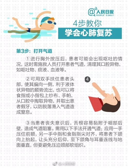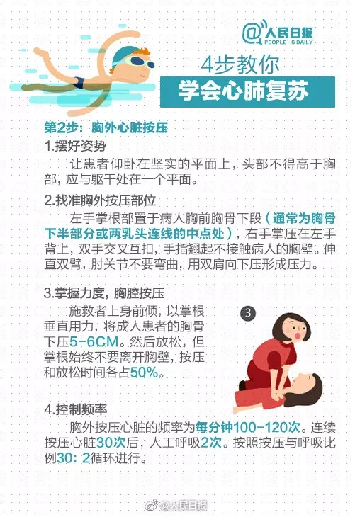 如何急救 1、青少年在发现有人溺水时,不能贸然救助,防止在救助他人时自己溺水身亡。应向四周大声呼救,请周围的成年人救助溺水者;现场可用投木板、救生圈、长杆、绳子、塑料袋、书包等方式,让落水者攀扶,增加救援时间。 2、应迅速清除溺水者口腔、鼻腔内脏物,使其保持呼吸通畅,以便实施心脏复苏即胸外按压急救。 3、如果出现以下情况,禁止胸外按压,需拨打120等待救援:胸廓畸形或心包填塞、胸壁开放性损伤、肋骨骨折。