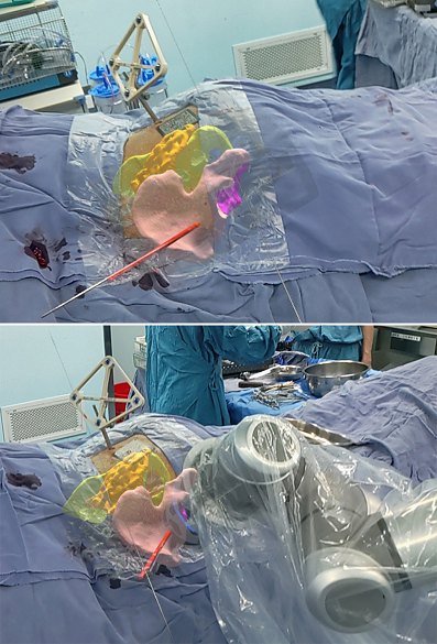 术前医生在数字医学中心工程师帮助下通过CT数据,进行骨盆的三维重建和模拟复位,并进行钉道设计,在虚拟的模型皮肤上进行螺钉进钉点和进钉方向设计。手术中通过这一模型直接和真实的患者进行配准,这样就可以快速地进行体表定位,便于大致确定皮肤切口和钉道方向,然后通过骨科机器人就可以更为精准微创地植入螺钉。